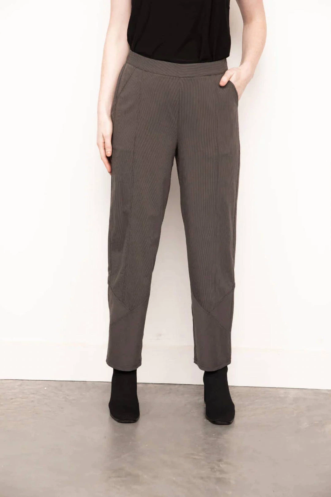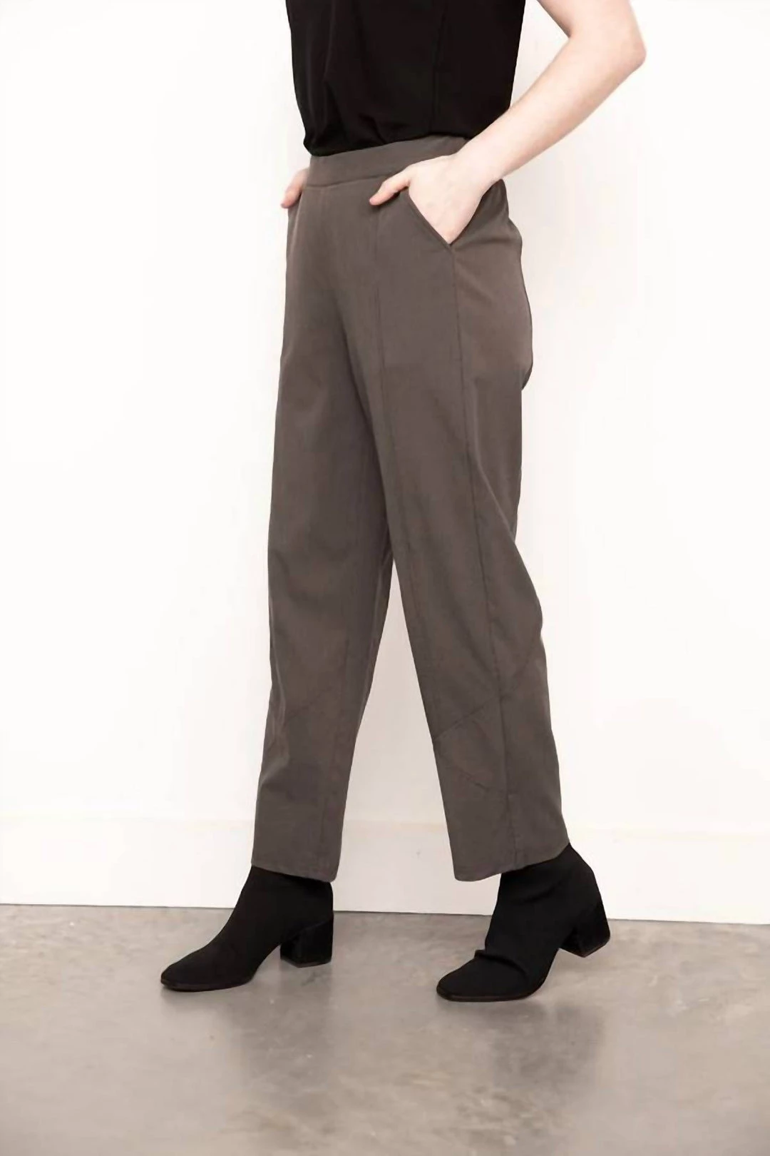 Featuring a flat front with an easy slip-on waist, side pockets, easy contouring through the hip, and a full leg that tapers slightly at the ankle.