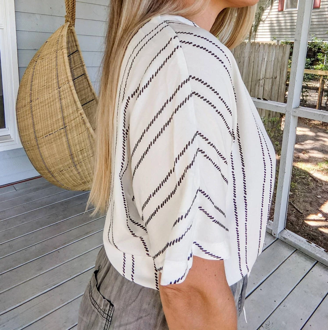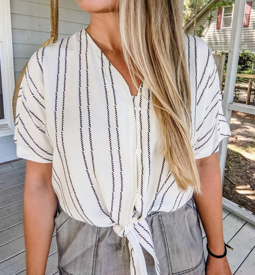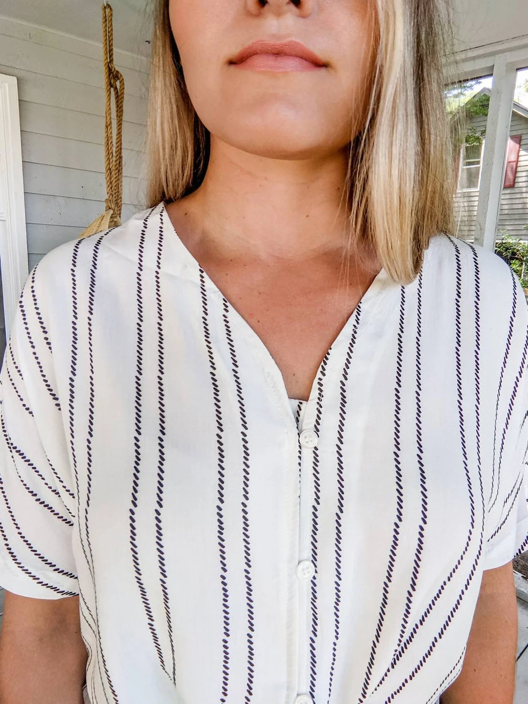 The top is a light weight material to keep you cool all summer long. V-neckline and buttons along the front. The bottom features a tie to cinch the waist. The sleeves hit right about the elbow for a flattering look. The vertical blacks lines are also a nice touch. Fits true to size!Fabric Care – Machine Wash Cold on Delicate, Hang DryModel Info – Height 5’1, Bra Size 34 C, Wearing SizeΓΒ Small
