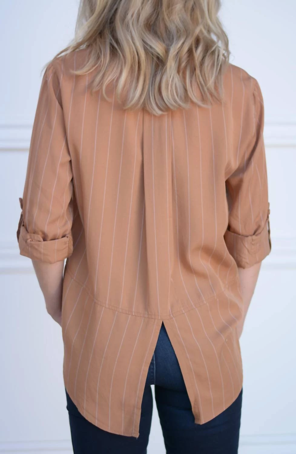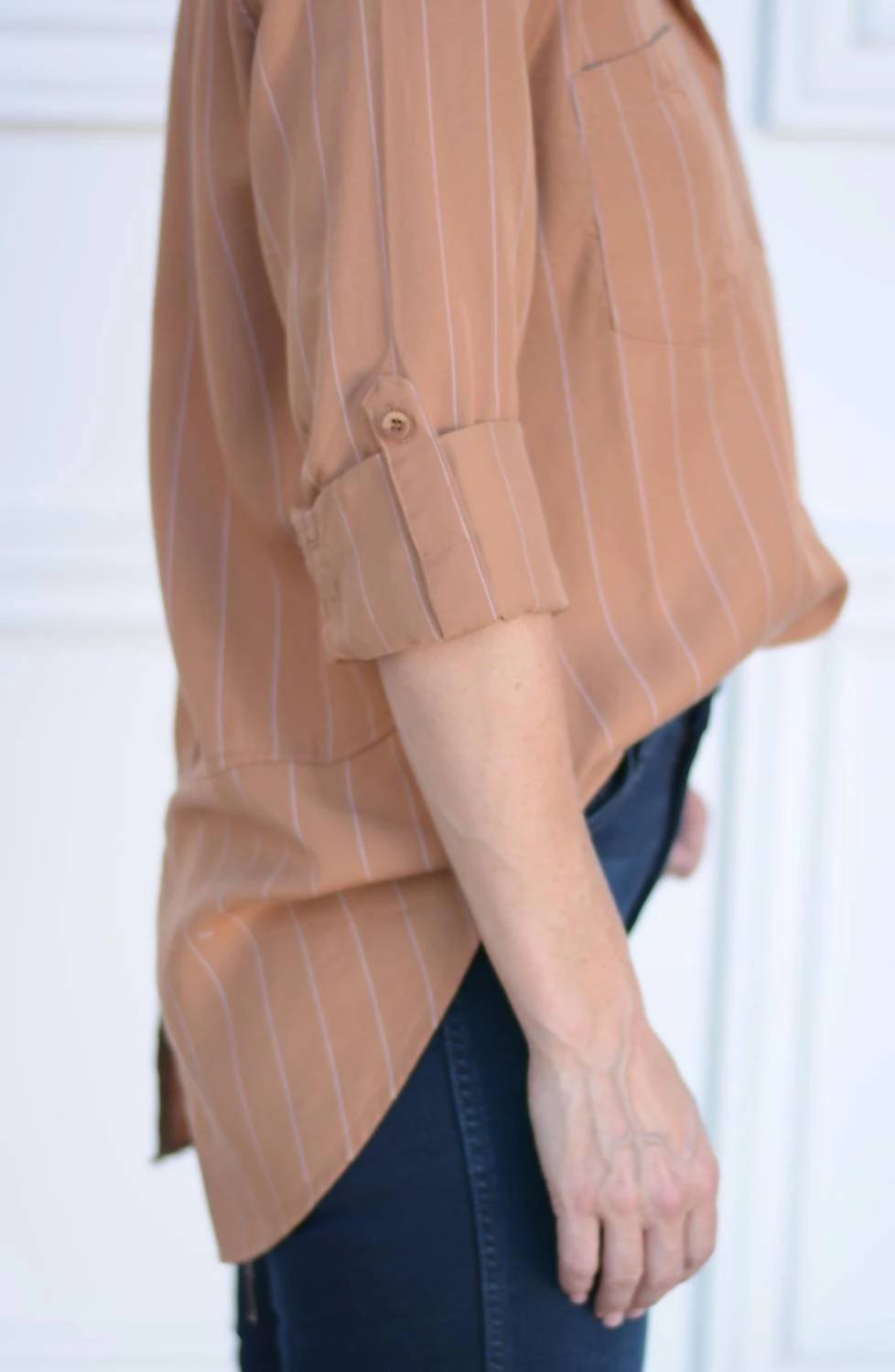 Details – Collared blouse with V-necklineFull button front with concealed buttonsTwo pockets on bodiceSubtle stripe printTab detail on sleeveHigh low hemline with 9″ slit detail on back2″ dart detail on backรย Soft tencel materialPerfect for the office or the weekendModel Details – Height – 5’4″Bust – 32″Waist – 26″Hips – 32″Wearing size XSCare Instructions – Machine was coldWash with like colorsDo not bleachTumble dry lowLow iron if needed