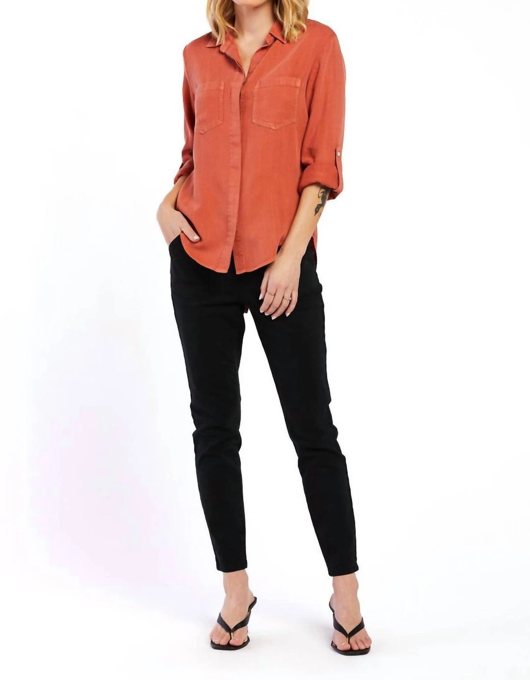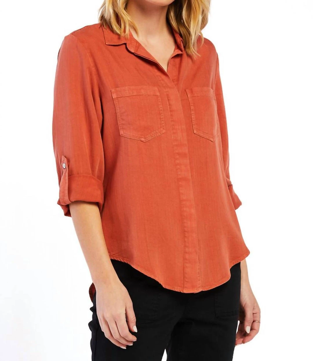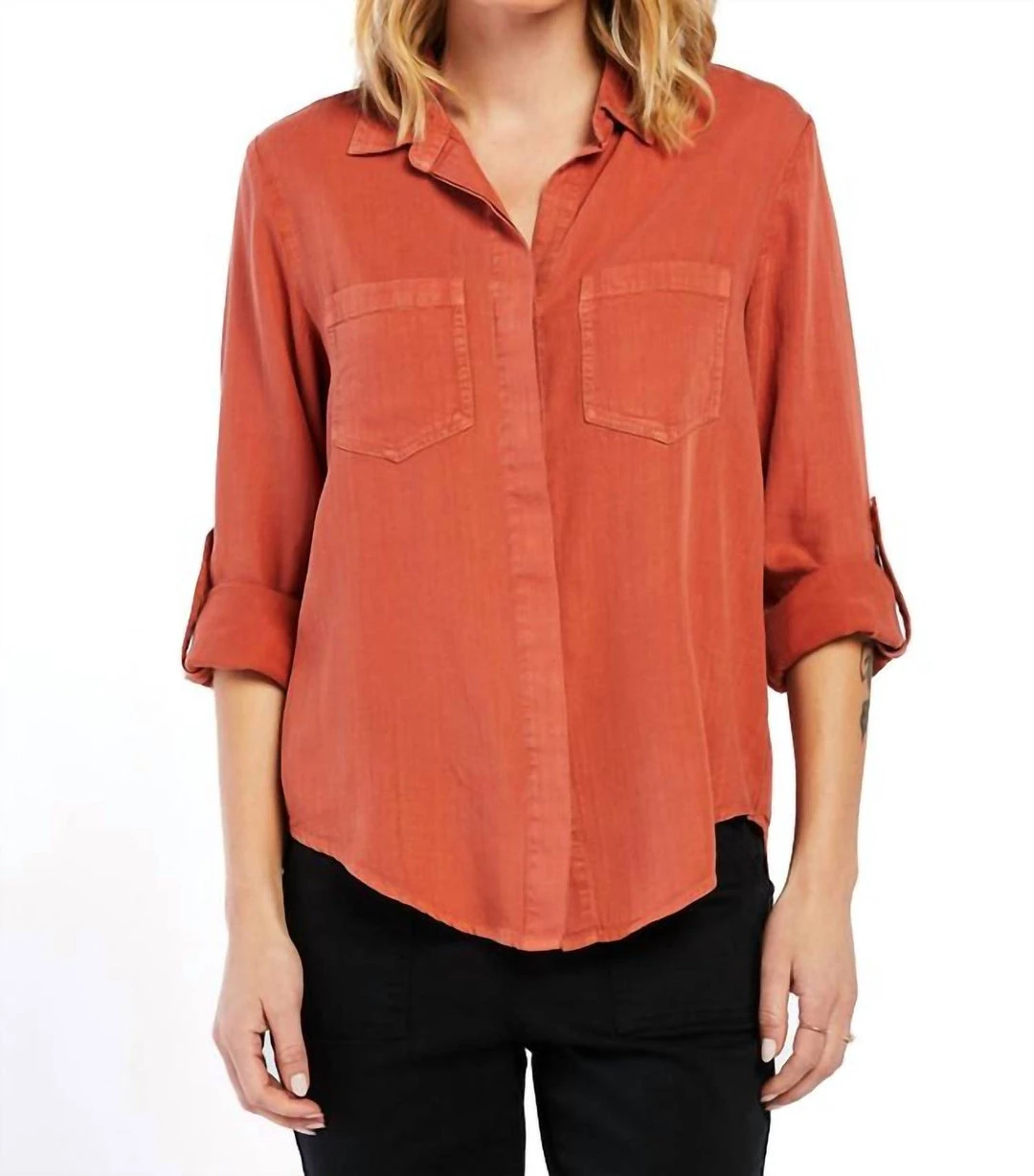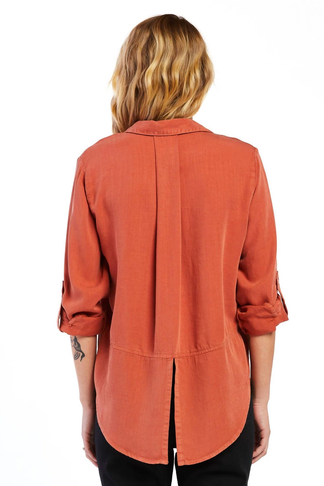 The Riley collared button down shirt features rolled tab sleeves, double chest pockets, and a split back tail.