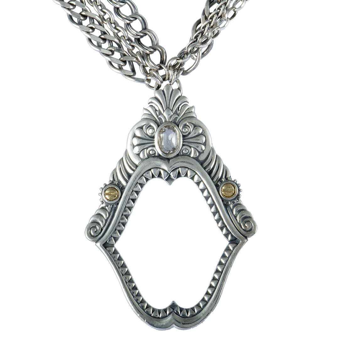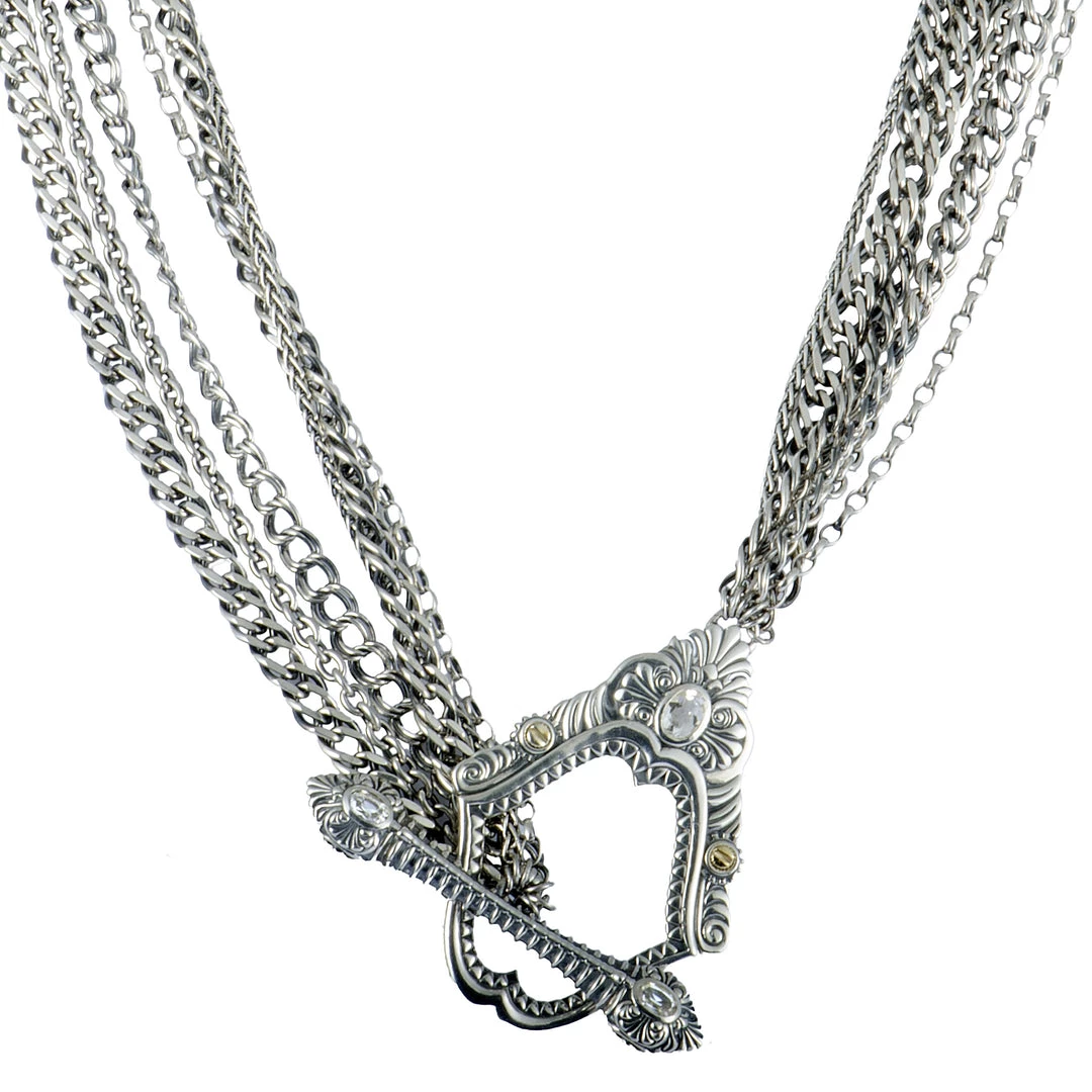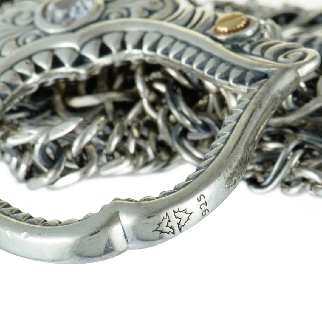 This extraordinary statement piece boasts a stunning pendant that is designed in a compellingly offbeat fashion, attached onto multiple, diversely stylized chains for an intriguing effect. The necklace is presented by Stephen Webster within the exquisite โLes Dents De La Merโ collection, and it is masterfully crafted from striking silver that gives a distinctly edgy feel to this exceptional jewelry piece.