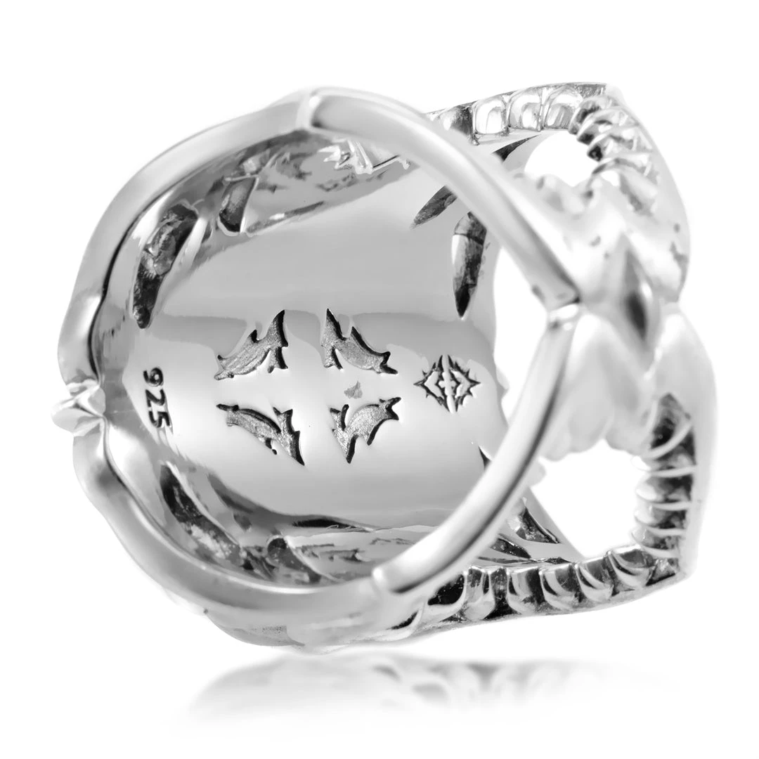 Danger and beauty are two intrinsic elements of the sea, and that is beautifully captured by this spectacular shark jaw ring that boasts a faceted stone gray cat’s eye quartz totaling 10.45 ct in a bezel setting. The filigree engraving of the ring and graceful lines of the two shark jaws provides an alluring aesthetic appeal that is both stunningly detailed and bold.Ring Top Dimensions – 20mm x 20mm