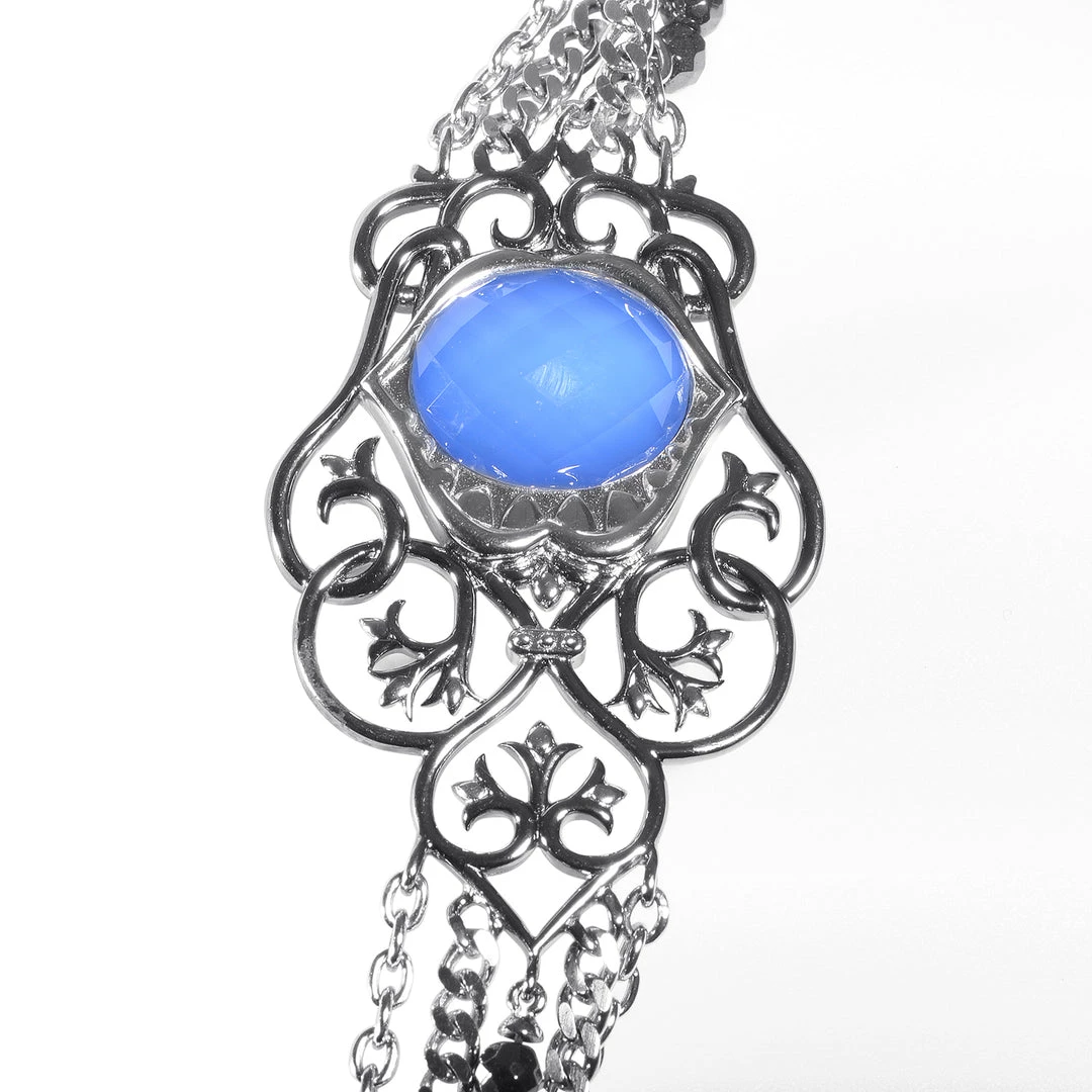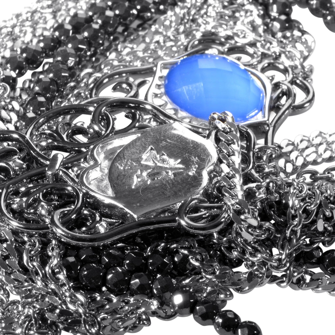 The majestic shark jaw motifs and delightful filigree patterns that complement the blue agate, hematite and quartz stones weighing in total 18.50 carats produce a spell-binding effect in this marvelous necklace of the highly revered Les Dents De La Mer collection from Stephen Webster.