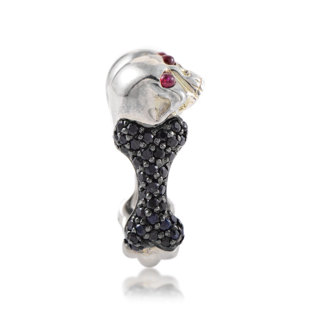 Designed for men with strong focus on offbeat masculine elements, this impressive Stephen Webster ring is made of silver and boasts eye-catching decoration in form of two skulls set with four rubies totaling 0.26ct, surrounded with 2.80 carats of black sapphires.<br/> Band Width – 4mm <br/> Ring Top Height – 8mm <br/> Ring Top Dimensions – 25mm x 8mm