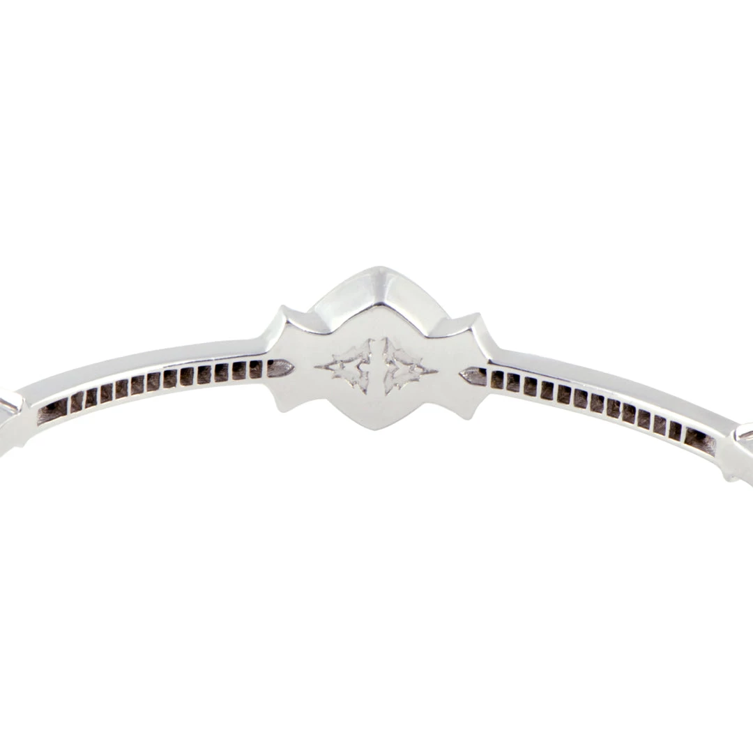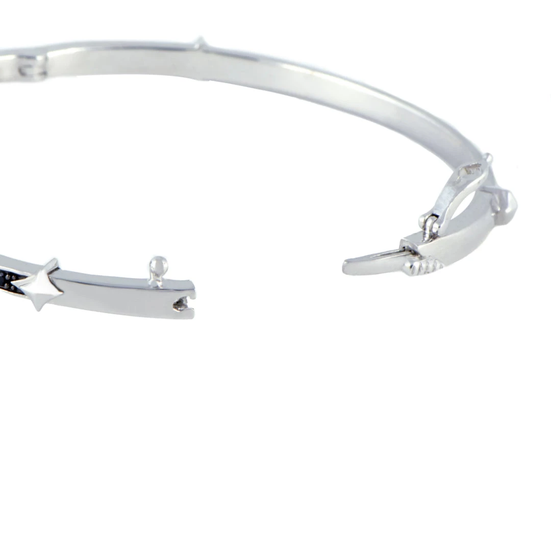 Striking black sapphires amounting to 0.27ct lead the eye to the magnificent central decoration comprised of gorgeous synthesized coral and quartz in this marvelous white rhodium-plated silver bangle from Stephen Webster’s renowned “Superstud” collection.