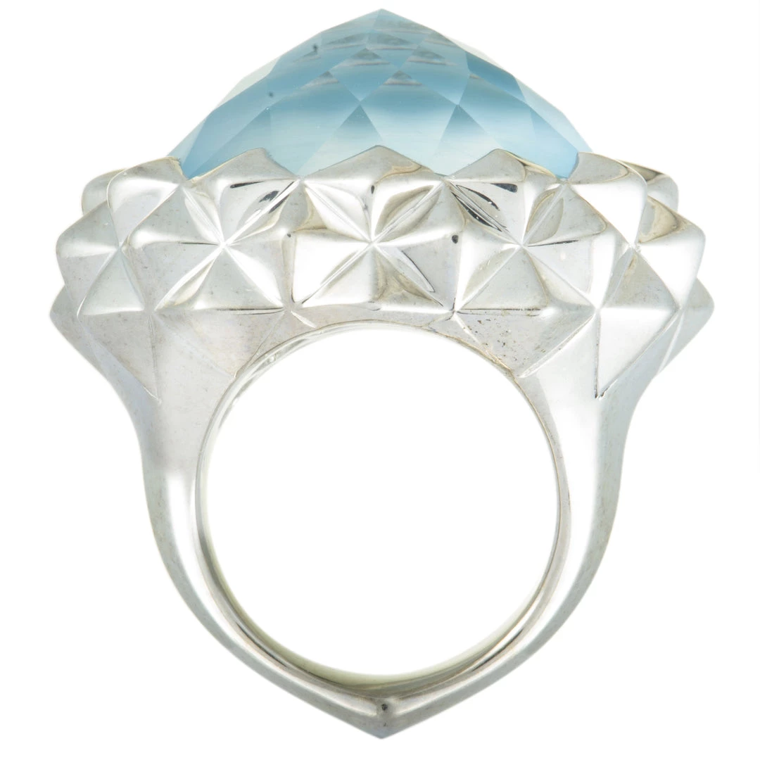 Sublime elegance with an edgy twist is embodied in this fabulous jewelry piece that is designed in an incredibly attractive fashion and beautifully decorated with alluring gems. The ring is presented by Stephen Webster and it is expertly crafted from silver, weighing 35.6 grams. This exquisite “Superstud” piece for women is splendidly embellished with mother-of-pearl, cat’s eye, and clear quartz stones.Ring Top Dimensions – 32mm x 32mm